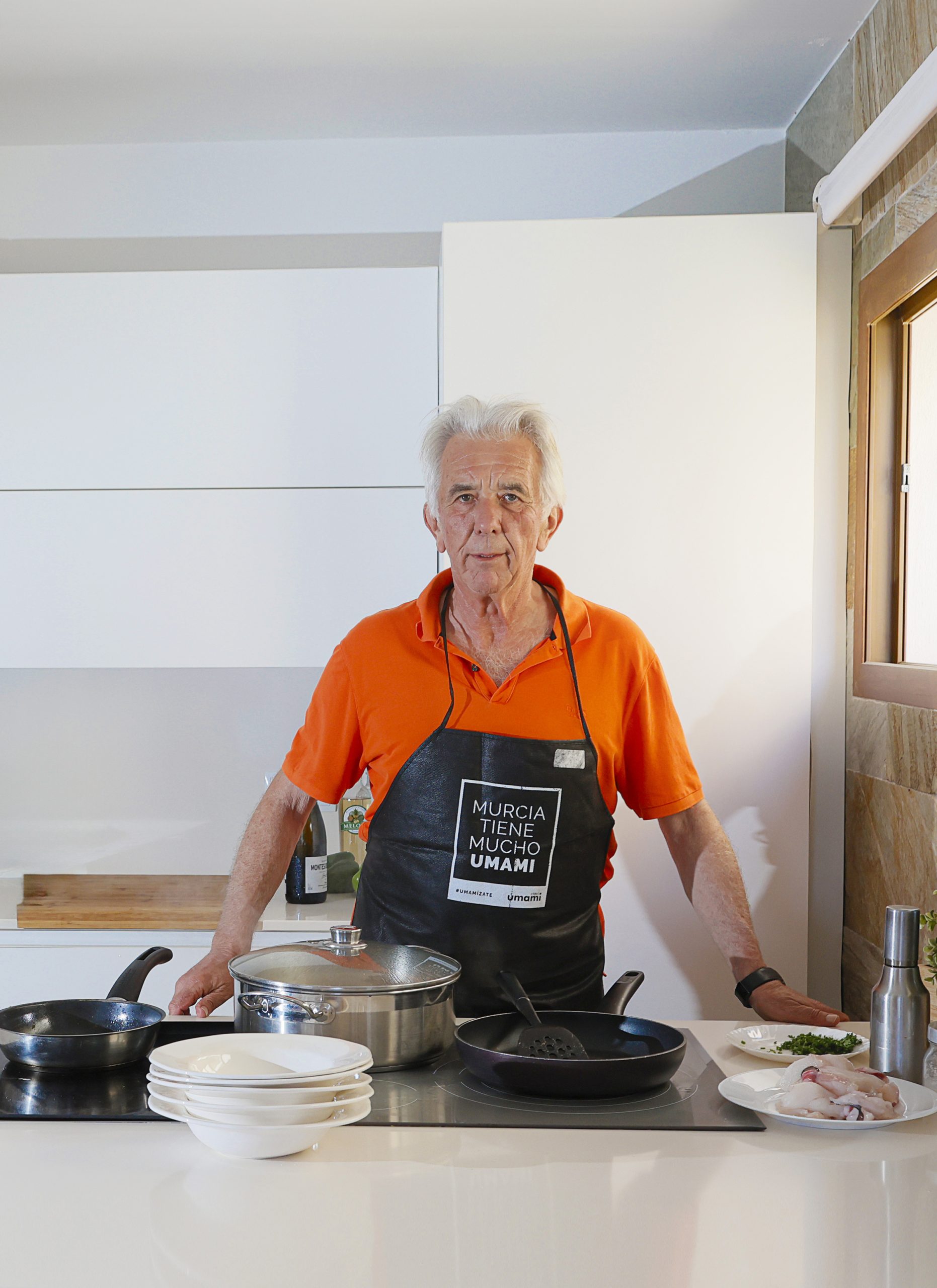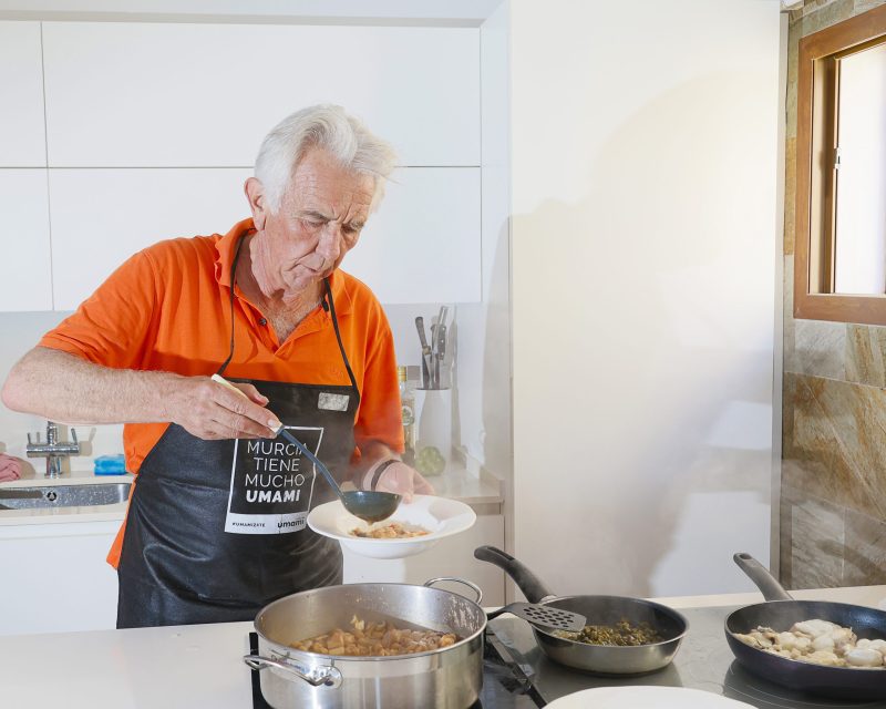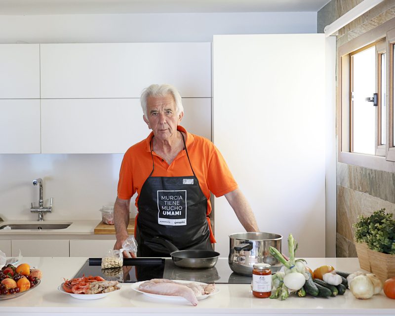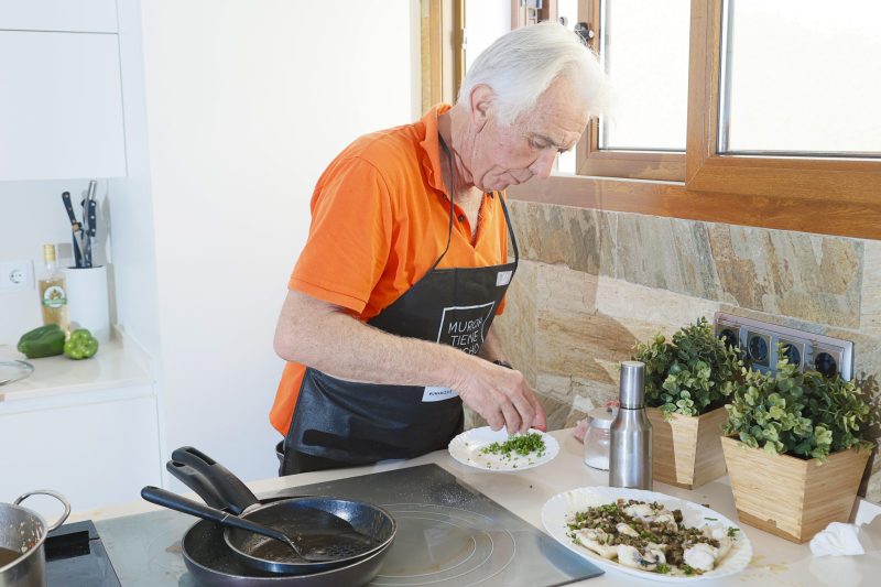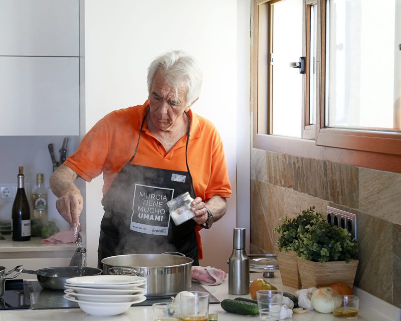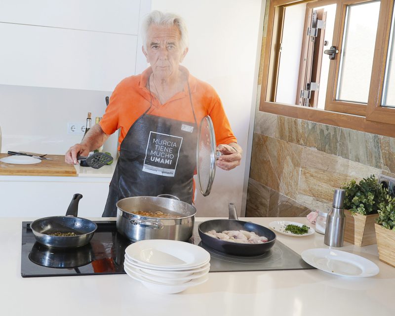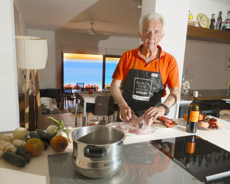 Su casa de Orihuela está pensada y diseñada para cocinar y recibir visitas, que es lo que más le gusta. Y digo diseñada porque hizo las obras oportunas para que desde la isla de la cocina se viera el mar mientras cocinaba. Aquí, Juan pasa muchas horas entre los fogones y recibe a familiares y amigos.