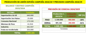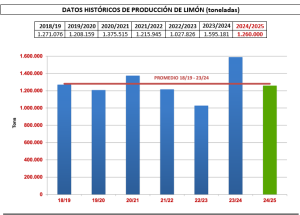 La estimación de cosecha de limón de AILIMPO para la próxima campaña 2024/2025, prevé una producción en España de 1.260.000 toneladas, lo que supone un descenso del 21% en comparación con el balance producción en la campaña 2023/2024 (que tuvo la mayor cosecha de limón registrada hasta la fecha), que se cierra con una producción final de 1.595.181 toneladas, de acuerdo con el balance provisional que contabiliza la fruta exportada, procesada, comercializada en el mercado doméstico, las mermas de peso y la fruta no recolectada.