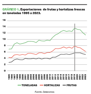 Al analizar la evolución de las exportaciones, se observa como en 2019 se produce el inicio de una tendencia a la baja, aunque las hortalizas se mantuvieron estables en 2020 y 2021, agudizándose su descenso en 2022 y 2023. Sin embargo, las frutas empezaron ya en 2020 su descenso y éste continua (ver gráfico 1).