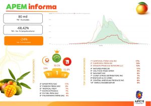 Los datos barajados por APEM también indican que respecto a la pasada campaña, ha habido una caída en el volumen comercializador de -68,42%, como consecuencia de los efectos del cambio climático en la industria del mango peruano.