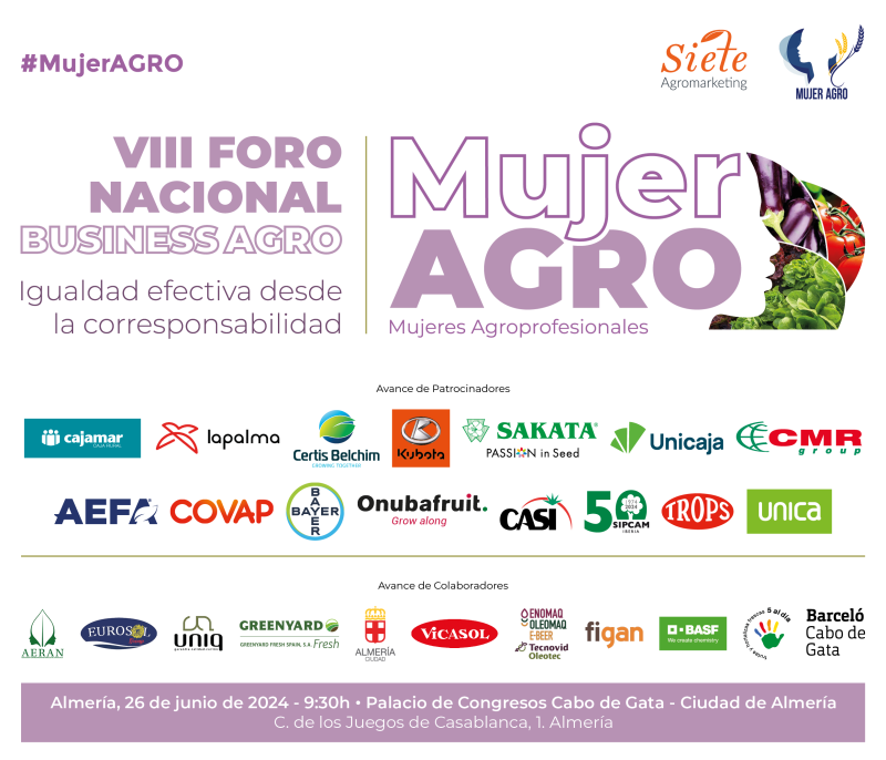 Siete Agromarketing y eComercio Agrario preparan los últimos detalles para que, el próximo 26 de junio, a partir de las 9.30 horas, Almería hable en firme de equidad, corresponsabilidad y retos que asumen de la mano mujeres y hombres agroprofesionales que avanzan hacia esa igualdad real que necesita esta actividad, una de las más importantes de España. Almería sabe bien la relevancia que tiene la agricultura. No en vano, esta provincia es baluarte de la producción de frutas y hortalizas en Europa, generando un valor añadido entre su población, directa e indirectamente. De esta forma, el VIII Foro Nacional BusinessAGRO Mujeres Agroprofesionales – MujerAGRO destacará esta aportación y pondrá en el centro de su edición de 2024 a los productos hortofrutícolas y su sector.