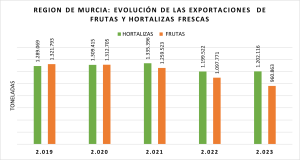 Las exportaciones hortofrutícolas de la Región de Murcia en 2023 ascendieron a 2.162.979 toneladas, lo que supuso 134.314 toneladas menos (-5,9%) con respecto a 2022, según datos de Aduanas procesados por la Asociación de Productores-Exportadores de Frutas y Hortalizas de la Región de Murcia (PROEXPORT).