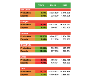 Las primeras previsiones apuntan a una producción de naranjas que será un 5,66% menor que la de 2023, con 15.478.167 T en total. Respecto a la categoría de mandarinas los datos destacan un aumento significativo de 11,58%, con un total 3.325.829 T. En limón, las primeras cifras indican una subida del 5,69%, totalizando 3.244.857 toneladas, mientras que la producción de pomelo disminuirá un 3,89% hasta 532.539 toneladas en total. Las estimaciones para las limas pasan por alcanzar 1.756.731 T, un 10,57% por encima de la cifra de 2023.