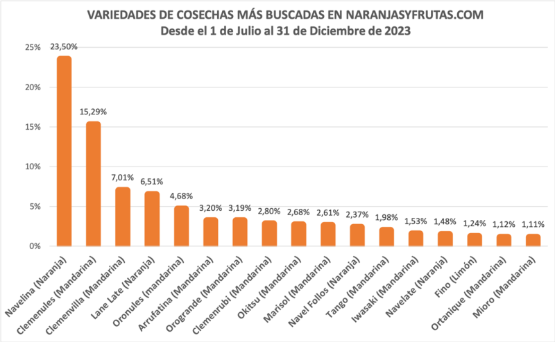 Cuando nos encontramos en mitad de la campaña de cítricos 23/24, la plataforma Naranjasyfrutas.com líder en España en el anuncio online de cosechas ha compartido las tendencias de las búsquedas por parte de los comercios mayoristas que compran este tipo de cosechas a los agricultores. Así, los resultado son los que se pueden observar en el gráfico en el que se aprecia como destacan Navelinas y Clemenules entre las variedades más demandadas por los comercios: