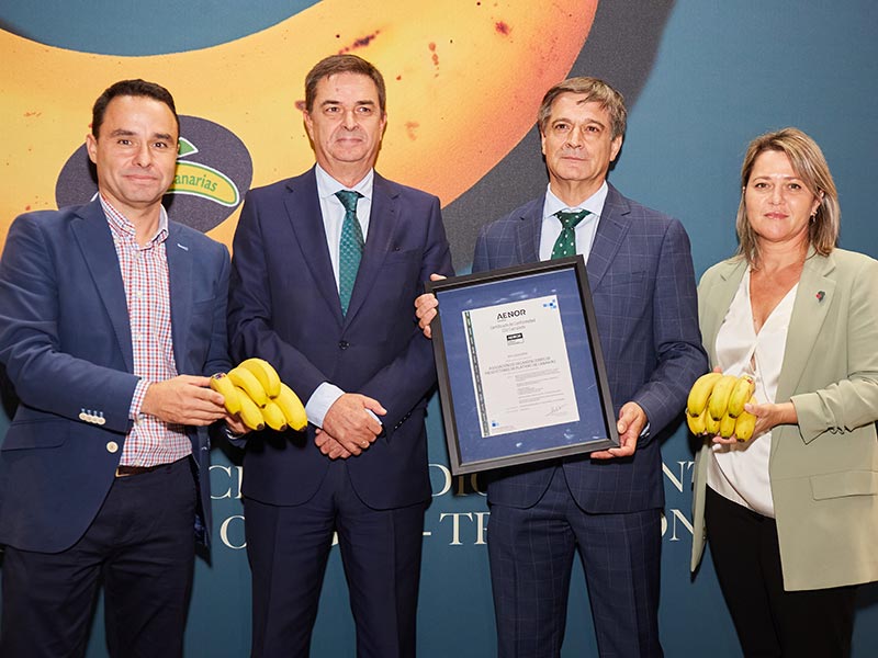 El certificado ha sido entregado por Gonzalo Piédrola, director de AENOR en la Región Centro & EMEA, a Domingo Martín Ortega, presidente de ASPROCAN. En el citado acto, celebrado en el marco de la Feria Internacional del Sector de Frutas y Hortalizas de Madrid, Gonzalo Piédrola ha explicado que “los datos de la renovación del certificado por parte de Plátano de Canarias implican beneficios medioambientales y económicos. Por un lado, refleja el compromiso de la Asociación con la sostenibilidad, y, por otro, abre mercados internacionales, redunda en las decisiones del consumidor y mejora la valoración en las operaciones de comercialización”.